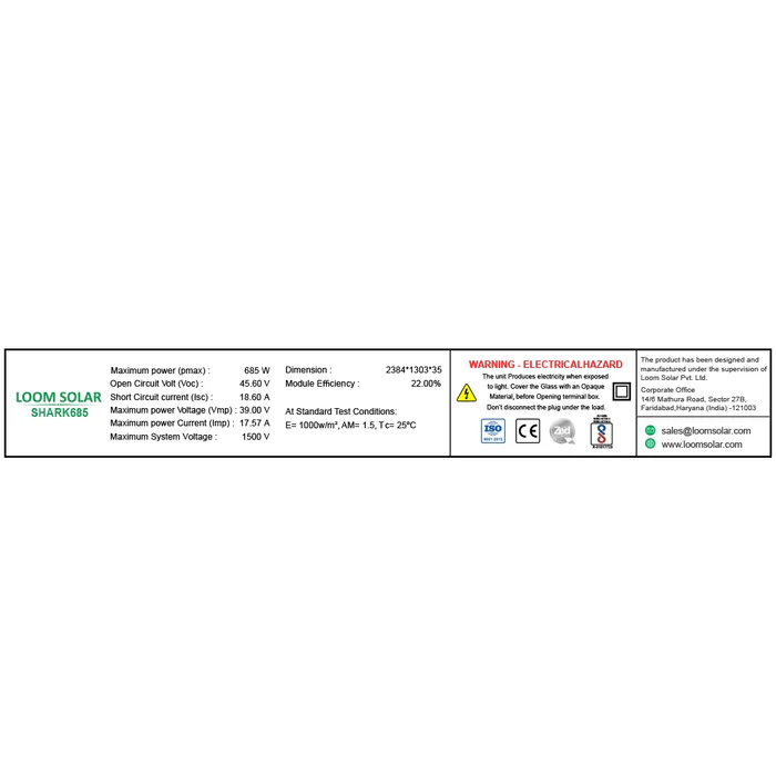 The Loom Solar SHARK 685 Wp N-Type Bifacial Mono PERC solar panel delivers an impressive peak power output of 685 Wp, with a high conversion efficiency of up to 22.0%. Its bi-facial technology allows the rear side to generate additional power, increasing overall efficiency to 25% and boosting total output to 700 Wp. Designed with 132 cells and 12 busbars, this advanced module ensures superior performance and reliability. It consists of a junction box that is IP68-rated and 3 bypasses, ensuring better protection. Additionally, when mounted at a height of 1.5 meters, it enhances power output by 7-20%, making it an ideal choice for maximizing solar energy generation.