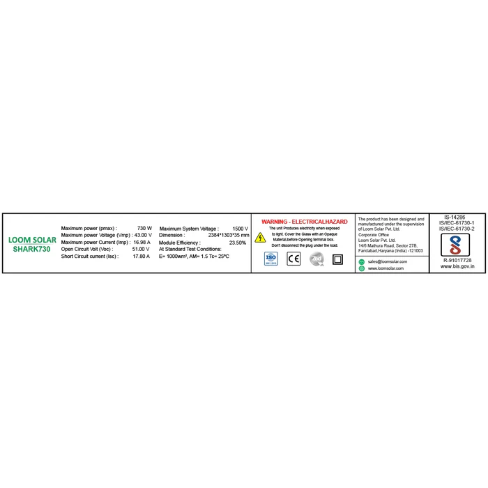 Loom Solar has launched its latest innovation, the SHARK 730~750 W HJT Dual-Glass Solar Panel, featuring cutting-edge Heterojunction Technology (HJT) for superior performance. With a high conversion efficiency of up to 23.5%, this advanced panel is ideal for solar farms, ground-mounted installations, and domestic, commercial, and industrial projects. It delivers an impressive peak power output of 795 Wp, with a total efficiency of up to 23.50% (front + rear side). It consists of an IP68-rated junction box and three bypasses, ensuring enhanced protection. Designed with 132 cells, it maximizes energy generation, further boosting output by up to 20%. When mounted at a height of 1.5 meters, it enhances power production by 7-20%, making it a powerful and efficient choice for high-performance solar solutions.